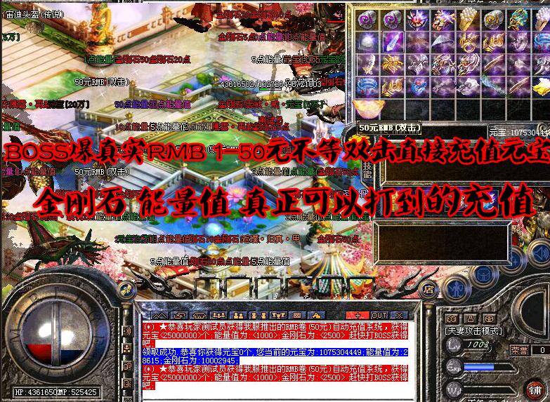15.新增加RMB充值卷 双击后自动充值到账户内包含元宝 金刚石 能量值 BOSS爆出