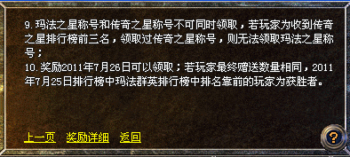 获得任何奖项5、女性玩家传说中的明星数量的排名在服务器上前3(并得到了传说中的明星数量约100)可以获得传说中的明星称号,传说中的明星称号最长的28天期限,女性收到了传说中的明星数量的排名在服务器上4到10(并得到了传说中的明星数量约100)可以获得玛星称号,玛星称号最长的期限为14天。